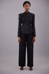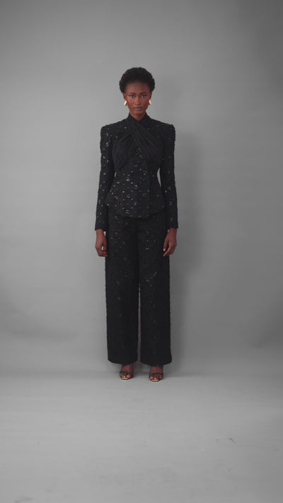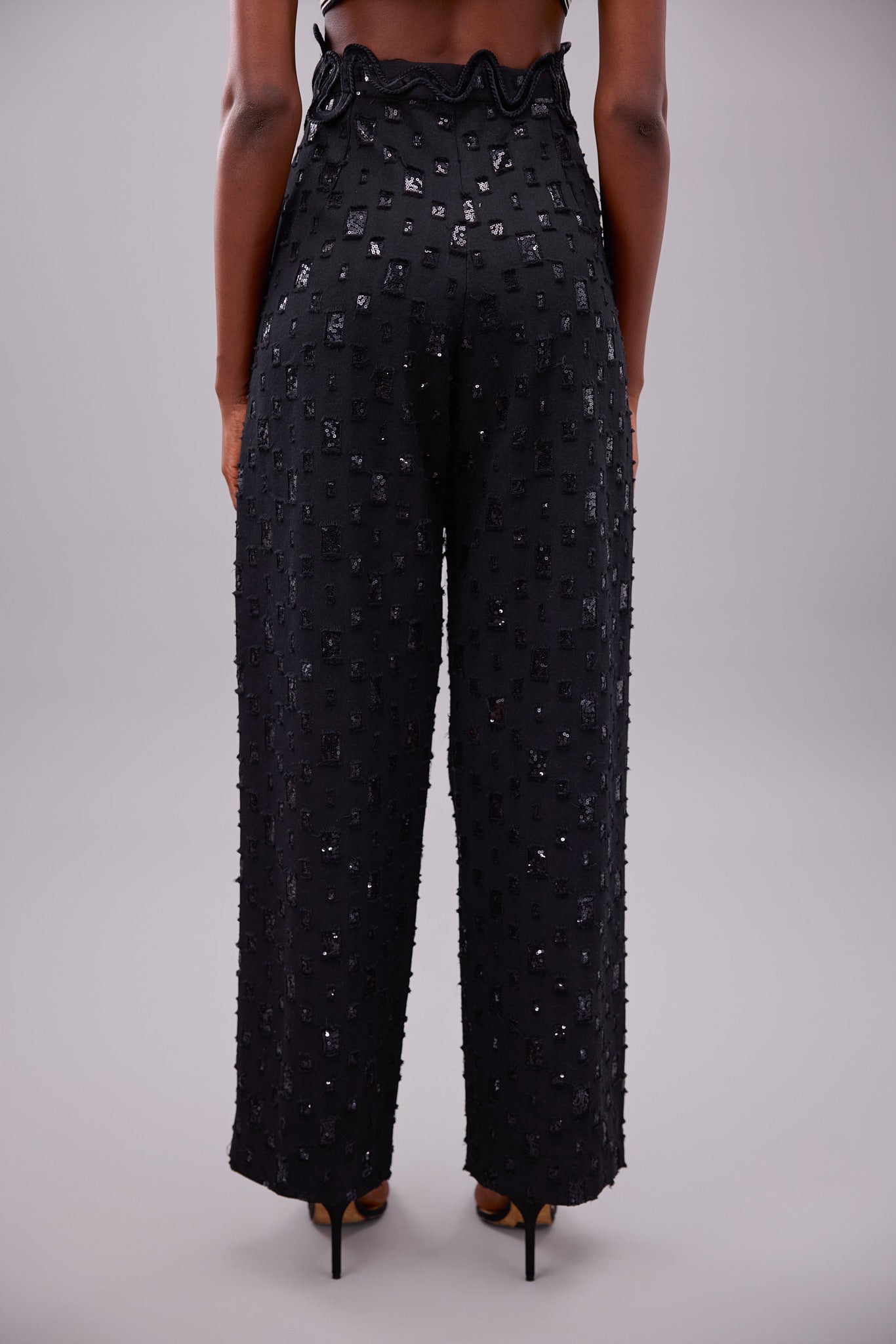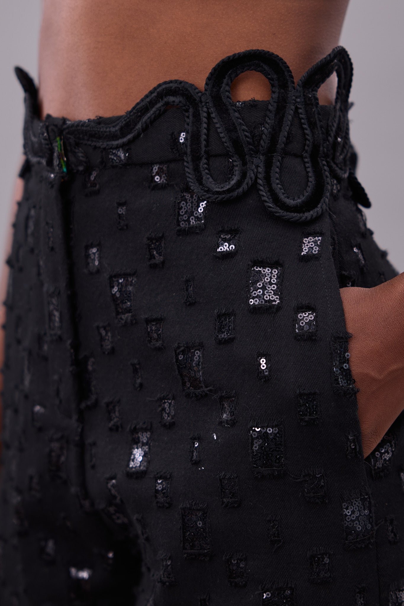 SEQUINNED DENIM WIDE LEG PANT WITH HAND-EMBROIDERED WAISTBAND