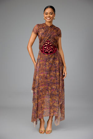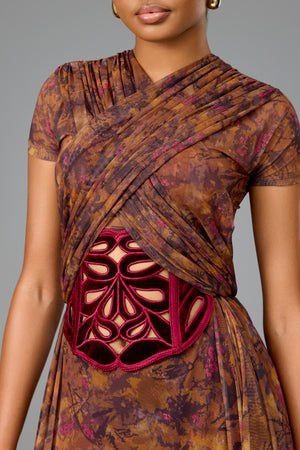 SHORT-SLEEVED TULLE WRAP-OVER DRESS WITH HAND-EMBROIDERED CORSET INSERT
