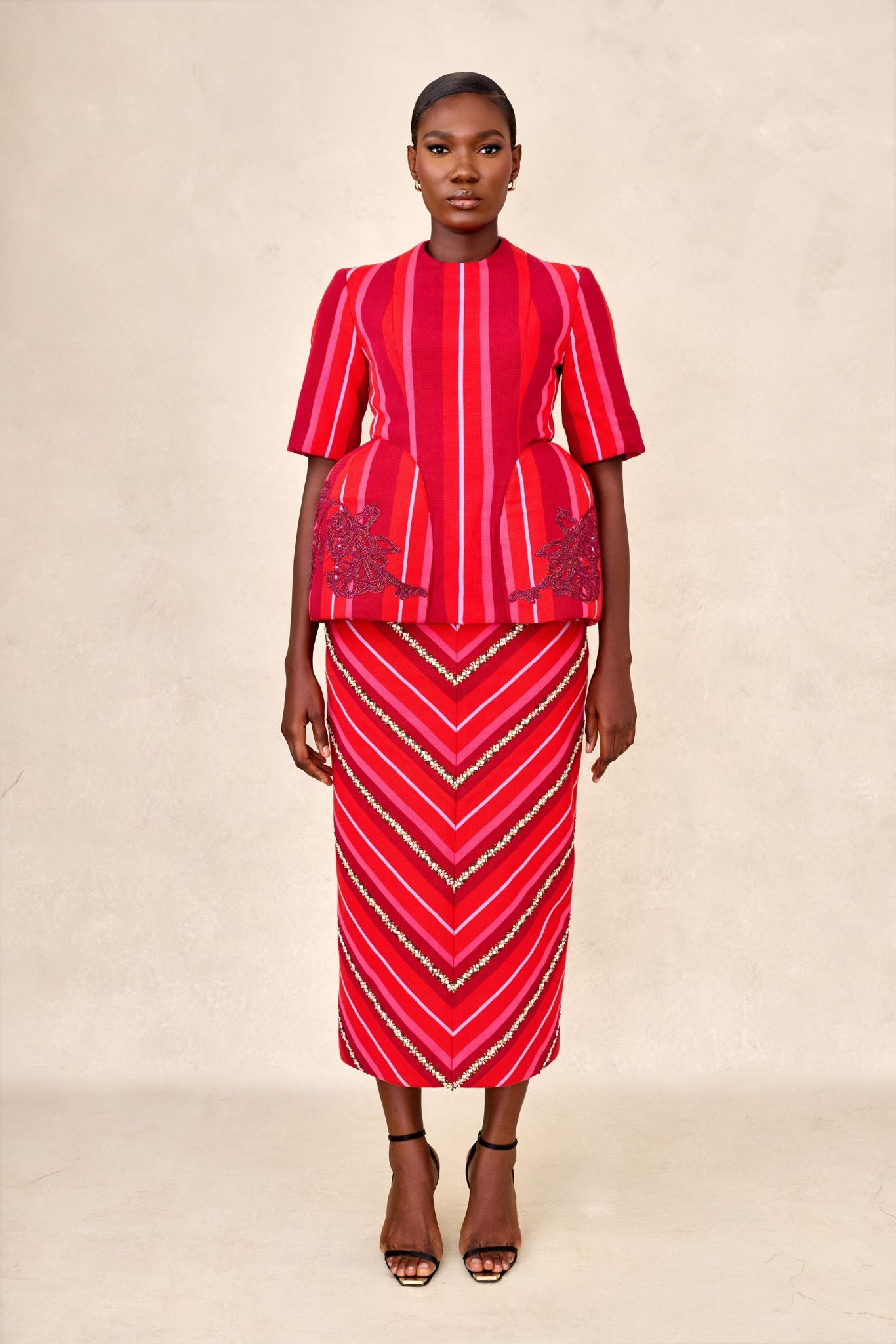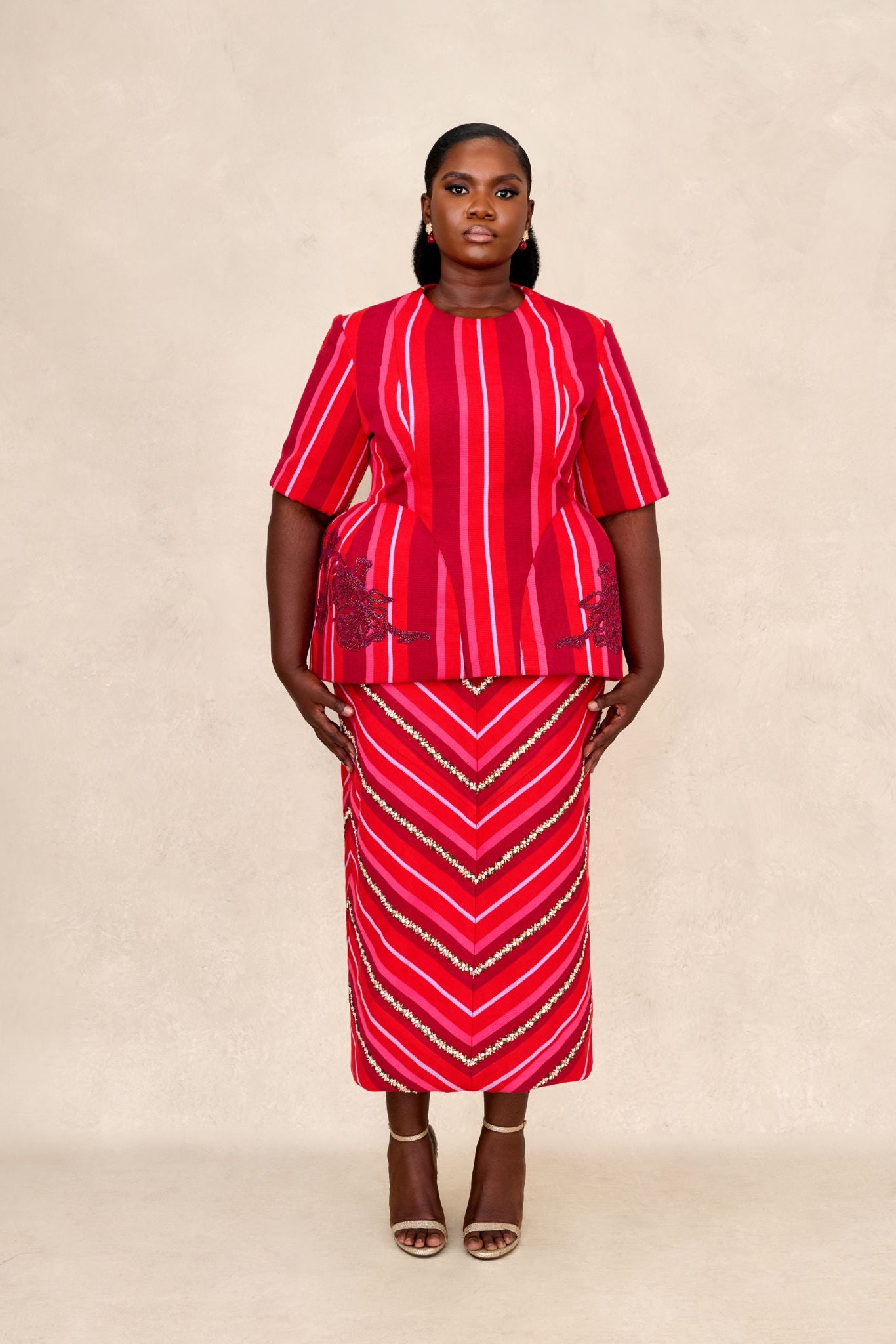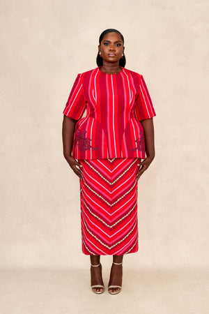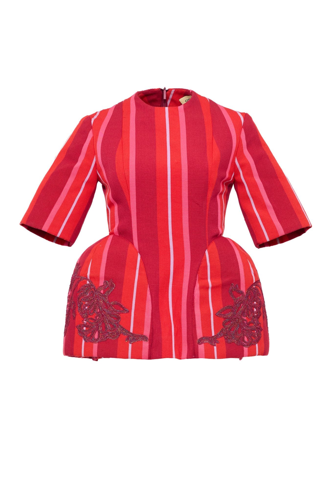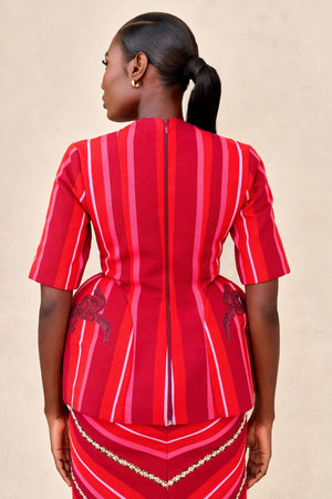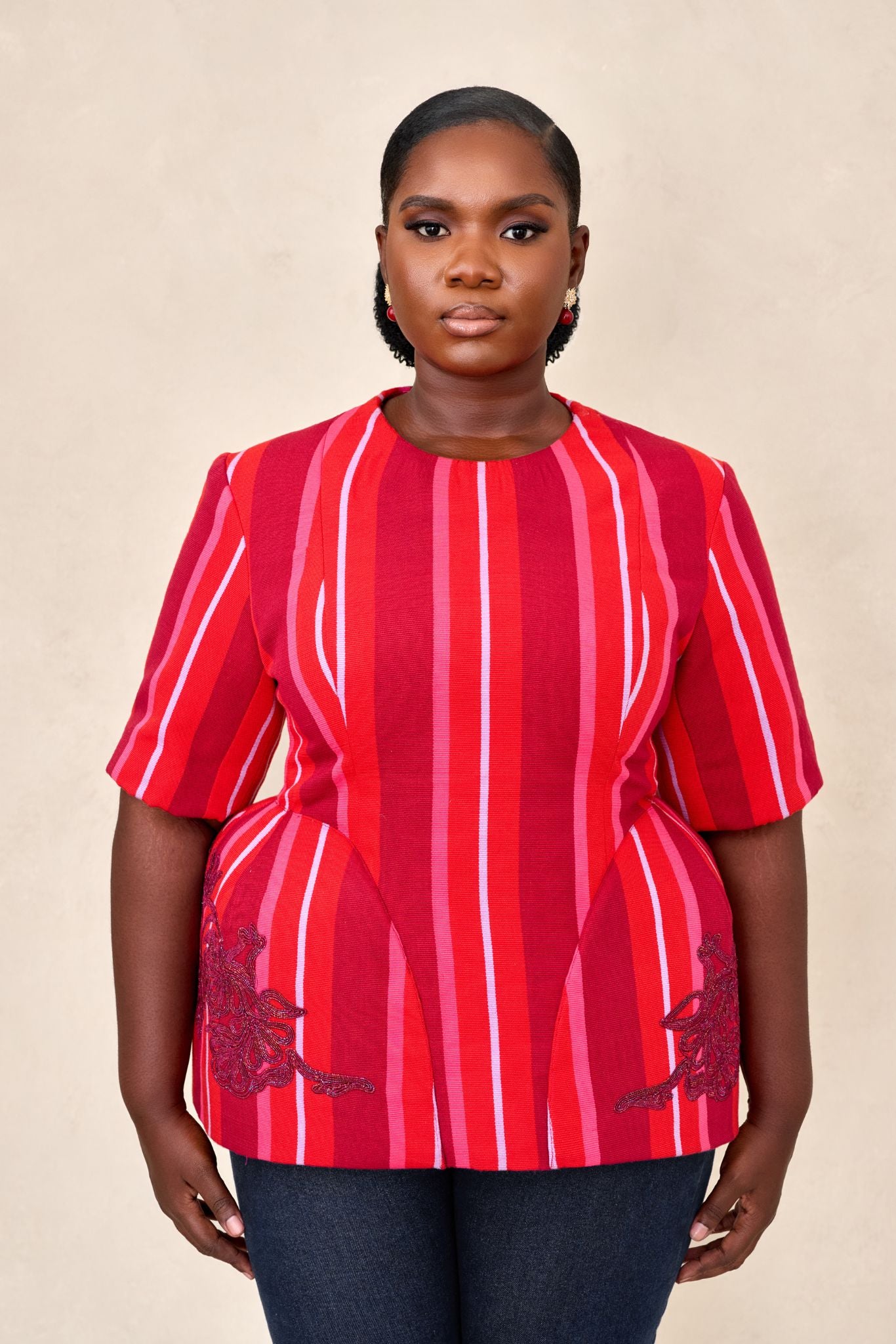 SHORT SLEEVE DOMED PEPLUM WITH HAND EMBROIDERED DETAIL