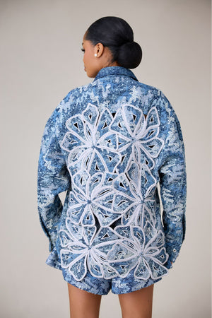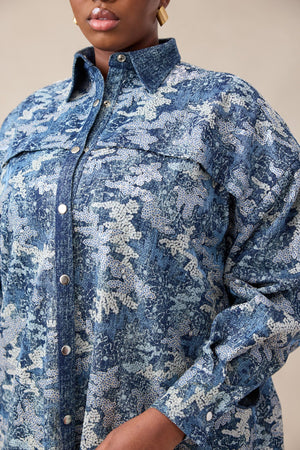 LONG SLEEVE SEQUINNED DENIM SHACKET WITH HAND EMBROIDERED DETAIL AT BACK