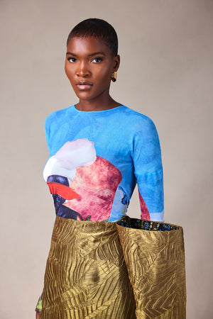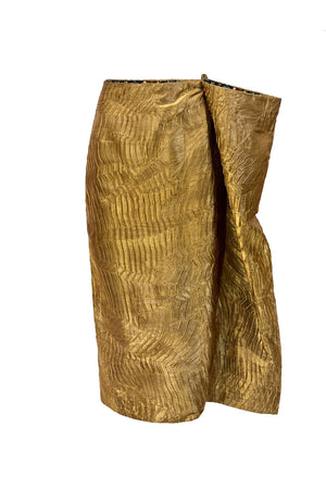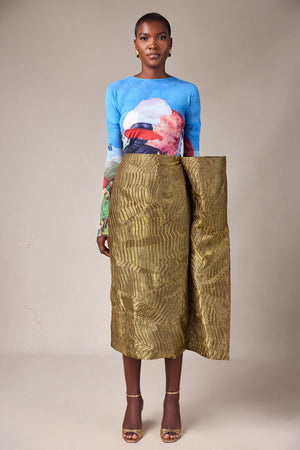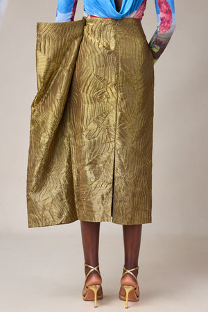 GOLD CRINKLE COLUMN SKIRT WITH DECONSTRUCTED CONTRAST DETAIL