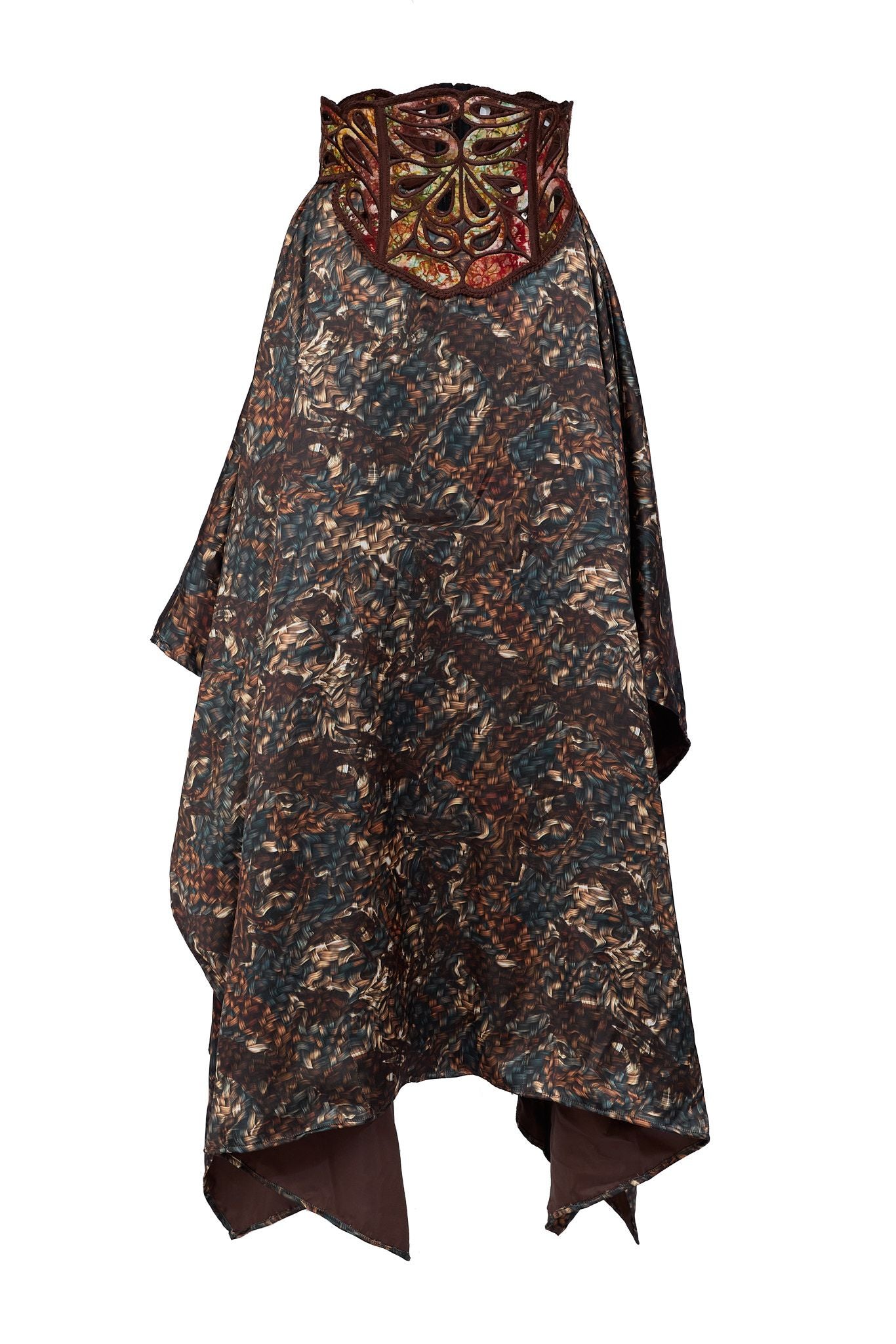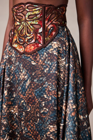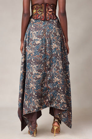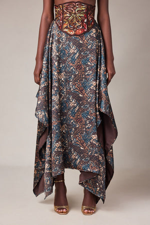PRINTED SILK ASYMMETRIC HEM SKIRT WITH HAND EMBROIDERED CORSET INSERT