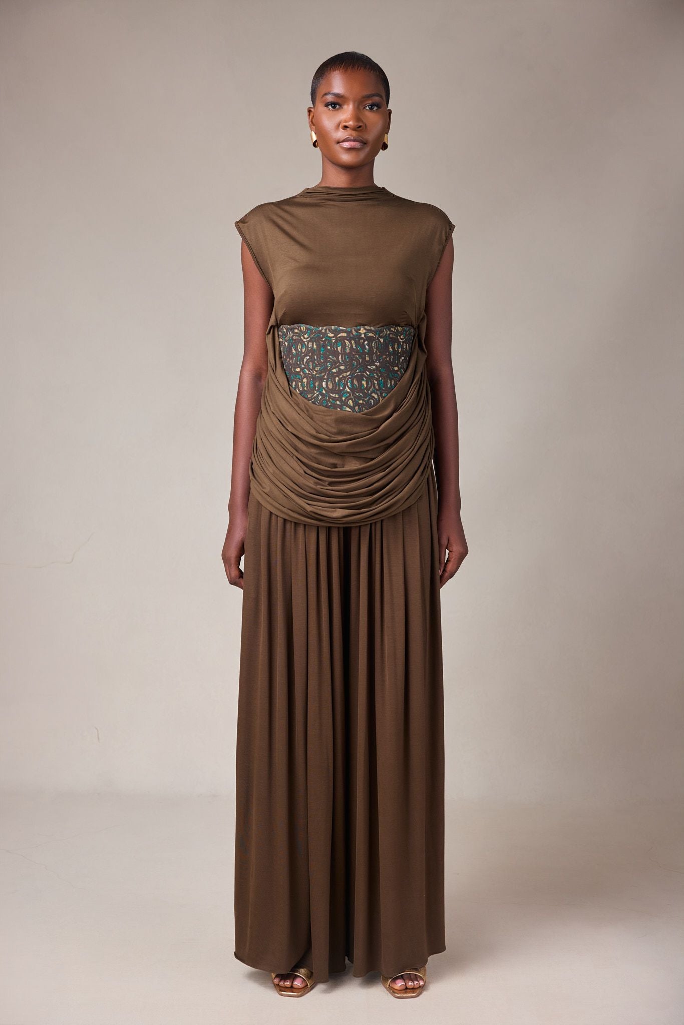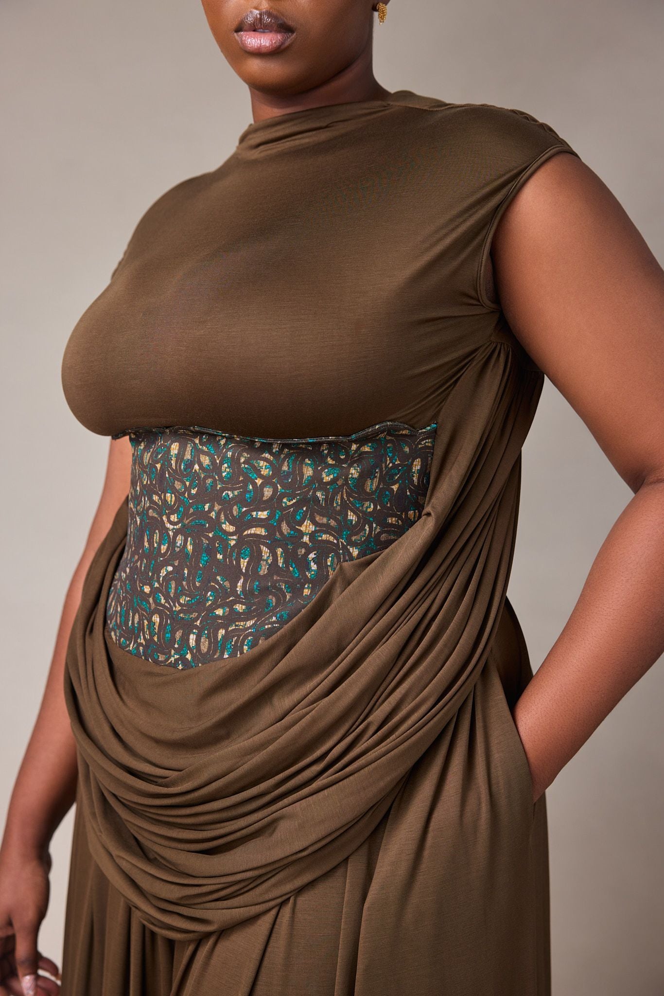 SLEEVELESS DRAPE FRONT KNIT BLOUSE WITH CONTRAST WAX PRINT DETAIL