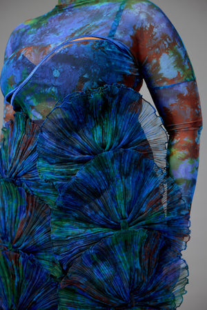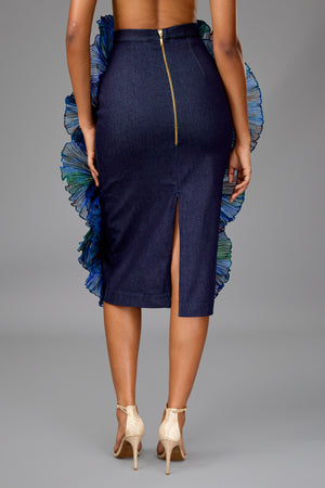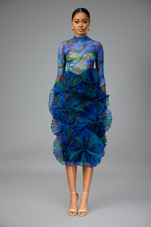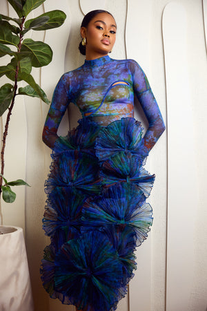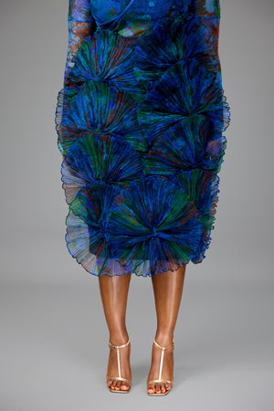BATIK PRINT RUFFLE ORGANZA SKIRT WITH PLEATED FLORAL APPLIQUÉ