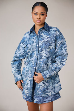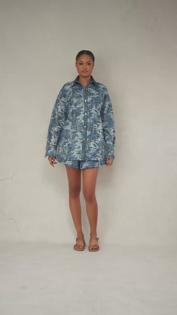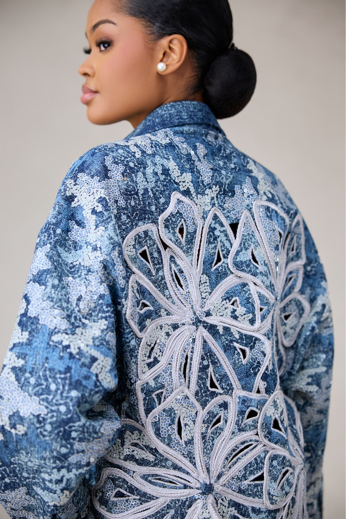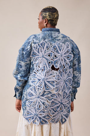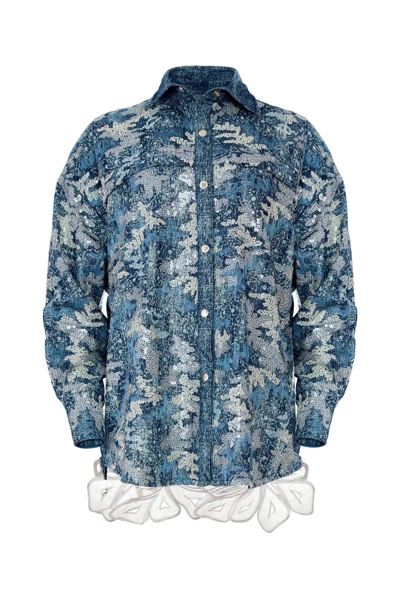 LONG SLEEVE SEQUINNED DENIM SHACKET WITH HAND EMBROIDERED DETAIL AT BACK