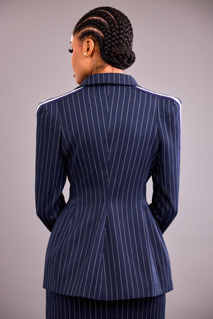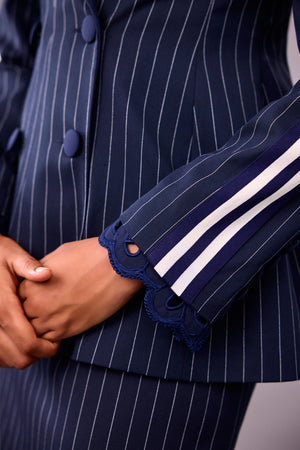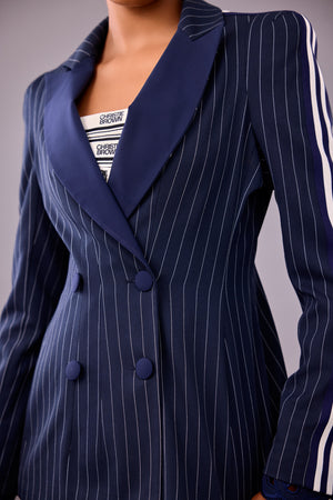 PINSTRIPE DOUBLE BREASTED JACKET WITH HAND-EMBROIDERED DETAIL ON SLEEVE