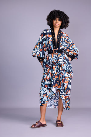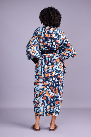 BUTTERFLY COTTON PRINT LONG SLEEVE KIMONO WITH HAND EMBROIDERED CUFF AND BELT