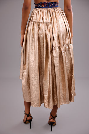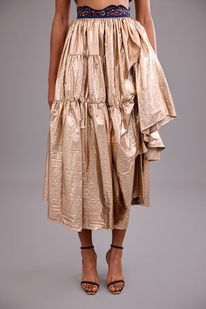 METALLIC GOLD TIERED MIDI SKIRT WITH AN ASYMMETRIC DRAPED DETAIL