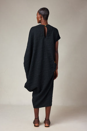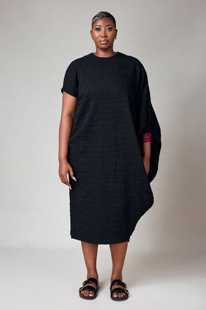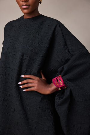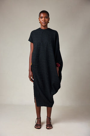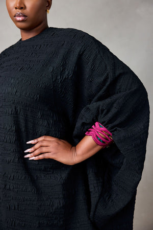 CRINKLE BLACK TEXTURED DRESS WITH HAND EMBROIDERED CUFF
