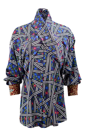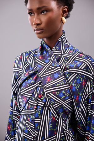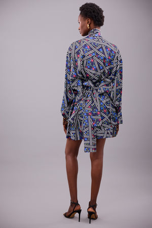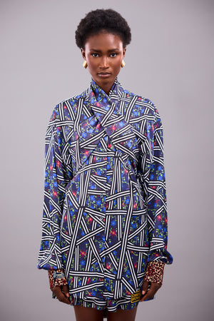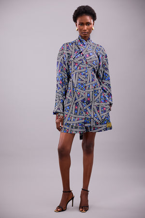 BLUE PRINTED LONG SLEEVE SHIRT WITH A CROSS-BODY TIE AND A WAX PRINT CUFF DETAIL