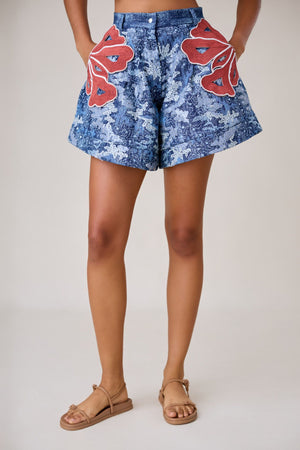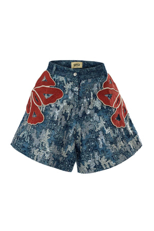 SEQUINNED DENIM MINI SHORT WITH HAND EMBROIDERED FLORAL DETAIL