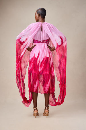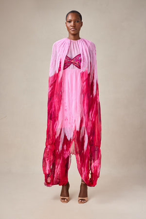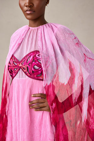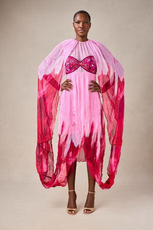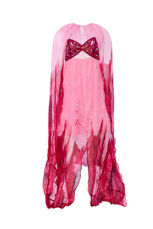 SLEEVELESS OMBRÉ CAPE DRESS WITH LAYERED HAND EMBROIDERED BRALETTE