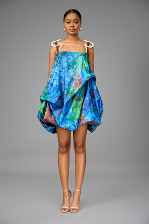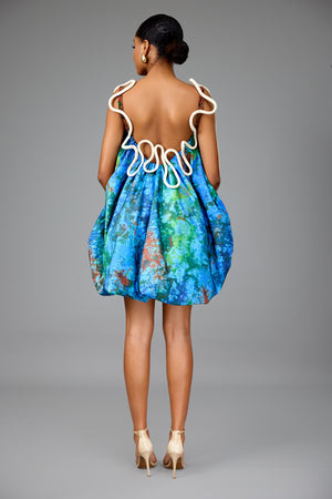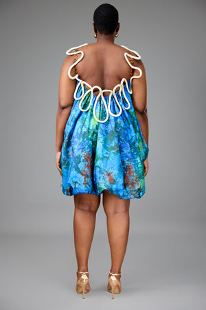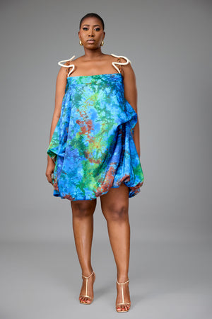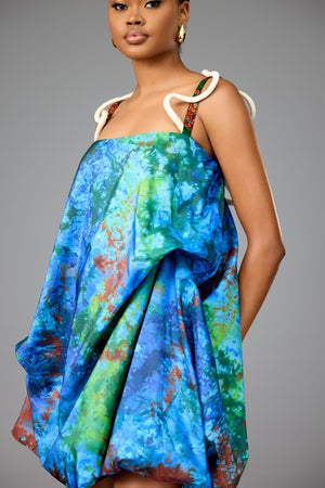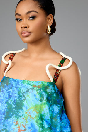 BATIK BUBBLE HEM DRESS WITH SCULPTURAL ROPE DETAILING ON STRAPS