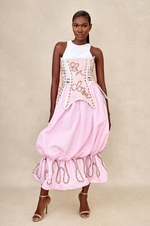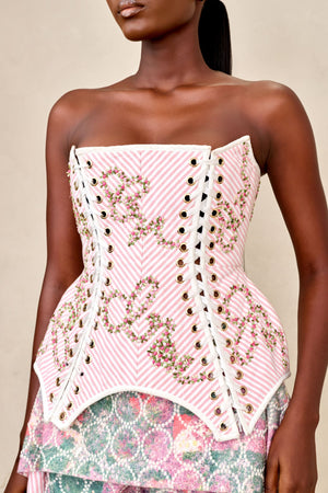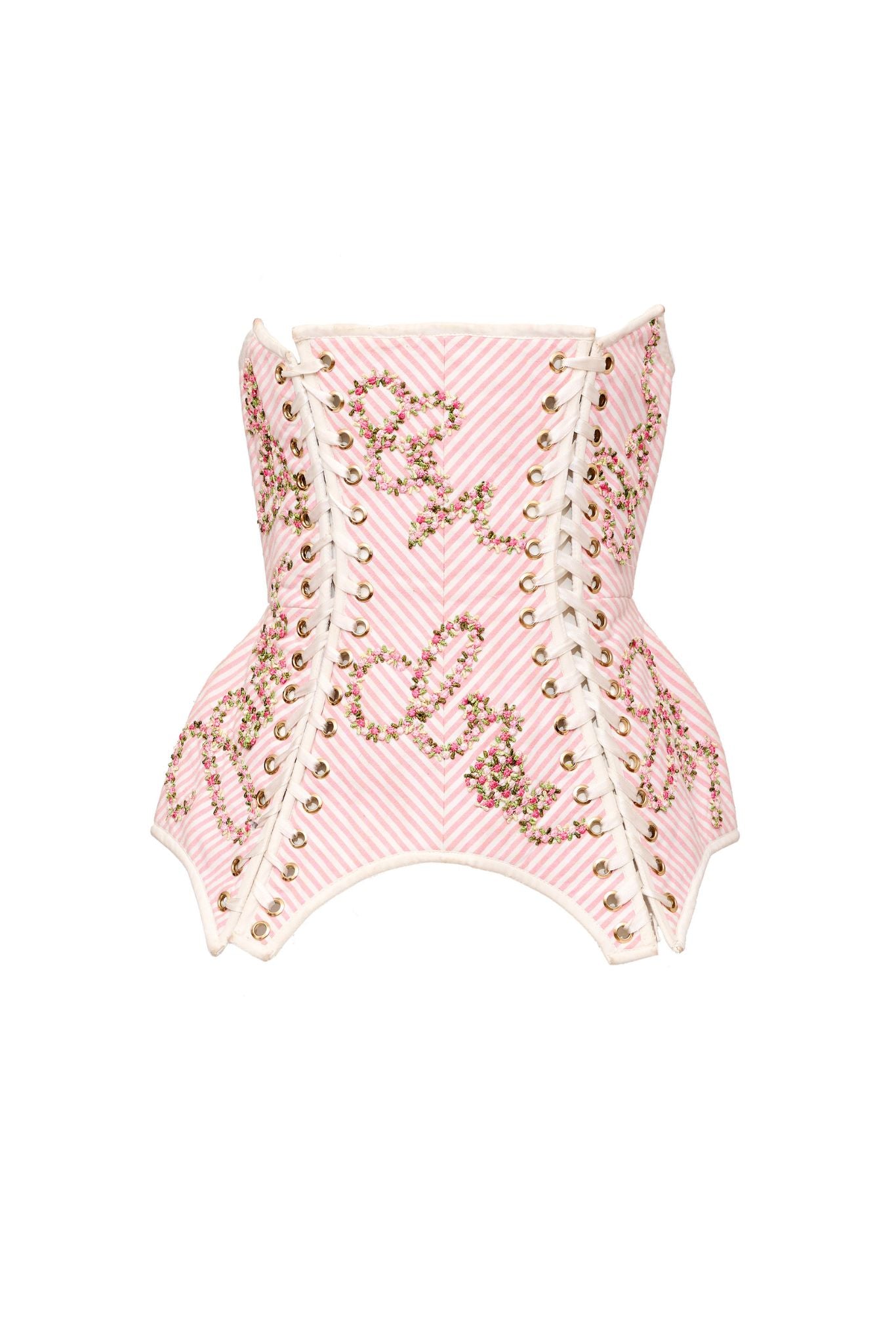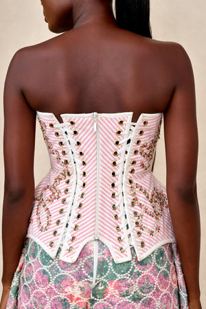 PINK AND WHITE STRIPES CORSET ACCESSORY WITH FLORAL EMBROIDERY AND FRONT LACING DETAIL