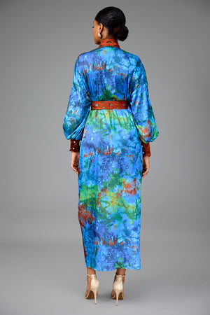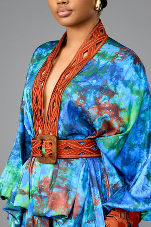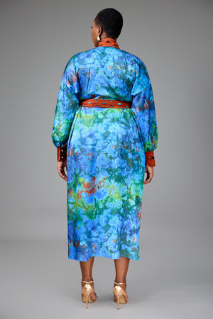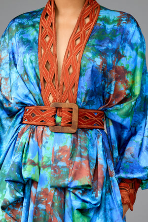 BATIK PRINT LONG SLEEVE KIMONO WITH HAND EMBROIDERED CUFF AND BELT