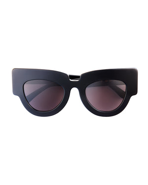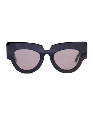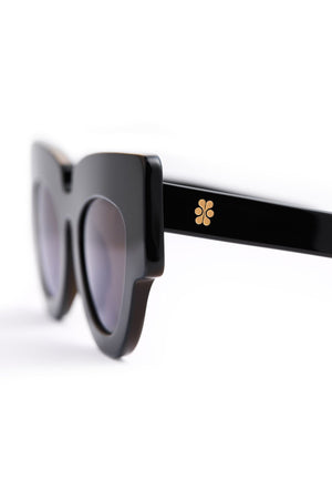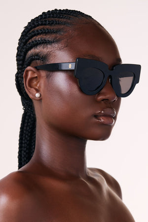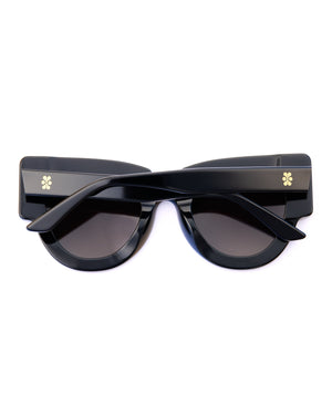Oversized cat-eye sunglasses with flat top are designed for the perfect bold, rounded frame. Classic yet retro, these glasses are crafted from black acetate, featuring gold-tone accents at the temples.